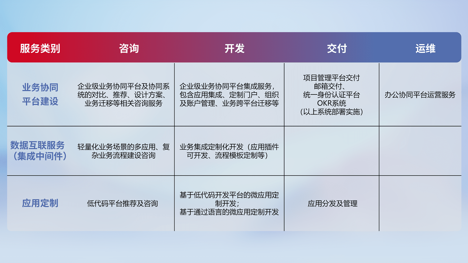 针对钉钉、、、企微、、、IDaas等平台级产品提供产品的规划、、方案、、、交付、、定制化开发等服务,,,实现如统一协同办公、、、、智能客户服务、、混合会议管理、、智能数据查询、、、、等业务场景,,实现数字化转型。。